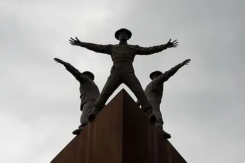 The figures are manufactured from bronze cast from a clay-modelled statue. The column is made of welded steel enclosed by corten steel.