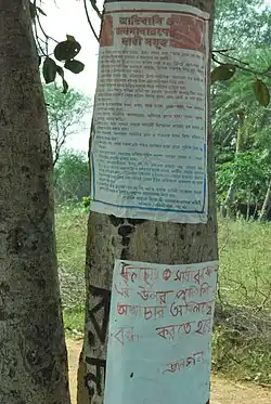 The locals allege that Lalgarh police station has long been torturing and detaining adivasis at the smallest pretext on basis of speculation. On 4 November 2008 evening, three boys all studying in high school between standards 8 and 10, were going to their homes in Bashber Village on foot. They were returning from Katapahari, where a program of Baul Song was going on. On the way they were picked up by Lalgarh police for being suspected Maoists[6] The villagers were enraged in the incident and surrounded the Lalgarh police station and blockades were made on several roads by felling trees and digging the roads. Later they formed a committee named Police Santras Birodhi Janosadharan Committee (transl. People's Committee against Police Atrocities) which demanded on thirteen issues and put up posters to publicise the same. The major demands include the Superintendent of Police of Paschim Medinipur district has to hold his ears and ask for forgiveness and he has to say 'Form now onwards I will stop illegally arresting the people and especially women' and release of those illegally arrested and cases has to be dropped against them. Some of the demands of the committee were met and cases against those children arrested were dropped. In turn the Committee removed some of the blockades, though police were not allowed to patrol the area. The Maoists congratulated the people of Lalgarh for their protest, but stopped short if claiming the movement to be under their control.[7] The people of Lalgarh however continually maintained that their movement was peaceful and for demand of basic democratic rights.