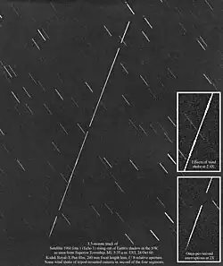 The photographs produced were time exposures in which a satellite's track appeared as a long, usually slightly curved, line seen against a background of stars. If the camera were stationary, the tracks of the much more slowly moving stars appeared as much shorter lines, which were portions of arcs about the pole. If the volunteer had a motor-driven polar-axis camera mount that countered the Earth's rotation, the stars were represented by dots whose sizes depended on the resolution of the camera lens and the magnitude of the star.