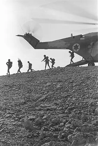 ![]() Israeli paratroopers landing on Shadwan Island from a Super Frelon helicopter | |||||||