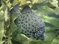 Oplegnathus punctatus, commonly known as the spotted knifejaw, is one of seven species in the Oplegnathidae family of knifejaws. These perciform fish, an order of ray-finned fish that are "perch-like", characteristically have teeth fused into a parrot-like beak during adulthood. They diagnostically have a single dorsal fin and body covered in small scales that are known as ctenoid scales. Knifejaws are typically distributed in the Indian and Western Pacific Ocean, near southern parts of the Korean Peninsula, Taiwan, China, Japan, and Hawaii.[2]