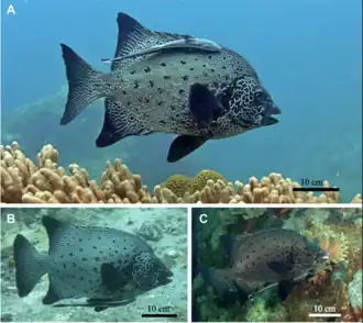 The fused teeth resembling a beak, enable the spotted knifejaw to prey on hard-shelled organism such as clams, sea urchins, and oysters.[5] Though there is limited research on specifics regarding dietary habits of the spotted knifejaw, past studies were known to suggest that they were primarily carnivorous fish due to their unique teeth structure. In depth research conducted to find stomach contents of spotted knifejaws, resulted in having large amounts of aquatic algae in the intestinal contents of all specimens collected. The experiment included seaweed, oysters, as well as a strong inclination to plant bait.[5] That same study also seemingly concluded that spotted knifejaws at different stages of growth seemed to prefer a certain type of diet over the other. Juveniles tend to focus more on seaweed as well as zooplankton while adults tend to veer off into larger prey. They had high preferences for cnidarians, chordates, as well as arthropods.[3] Given that their geographic distribution is a vast, their prey preference tends to mirror the different aquatic environments they are in with a correlation in crustaceans and zooplankton as well as phytoplankton.[5] More research is needed in those separate aquatic environments to distinguish between one another and have a more concrete dietary evolution specific to a region of Spotted knifejaws.[6] More recent studies have attempted to dive deeper into the possibility of them being omnivorous fish by way of multi-omics.[5]