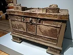 A rare very ornate strongbox was found in the peristyle, perhaps fallen from the upper floor, containing over 200 coins, jewellery, and a seal ring. It was finely decorated with inlay in silver, copper, and gilded bronze typical of late Hellenistic design, and had a complex locking system that was still used in the 19th century.