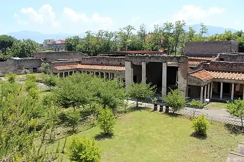 Like the nearby towns of Pompeii and Herculaneum, Oplontis was buried in ash during the volcanic eruption of Mount Vesuvius in 79 AD.[2] However, the force of the eruption was even stronger than at these cities as not only roofs collapsed, but walls and columns were broken and pieces thrown sideways.[3]