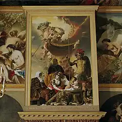 The Oranjezaal refers to a painted ballroom in the royal palace Huis ten Bosch in The Hague. It was once, together with its neighboring Chinese room, part of the first national museum of the Netherlands founded in 1800 called the Nationale Konst-Gallery. The supervisor Cornelis Sebille Roos appointed Jan Gerard Waldorp as the first custodian and curator to receive visitors (for 6 stuivers) and explain the collection.