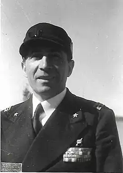 In July 1940, a month after Italy's entry into the Second World War, he was transferred to Benghazi as deputy chief of staff of the Naval Command of Libya. During the battle of Punta Stilo he volunteered for a bombing mission on British vessels; after his aircraft was hit by enemy fire and forced to ditch, his seafaring expertise proved decisive in helping the crew survive until rescued.[1] After promotion to captain for war merit in 1941, in 1942 he was transferred to Tobruk as commander of the Gazala Naval Detachment and commander of a flotilla of MZ motor barges, helping repel the British attack during Operation Agreement, for which he was awarded the Iron Cross First Class with Swords by the German authorities, and the Bronze Medal of Military Valor by the Italian authorities.[1][3] Overall, during his service in North Africa he was awarded two bronze medals and two war crosses for military valor.[1][4][5][6]