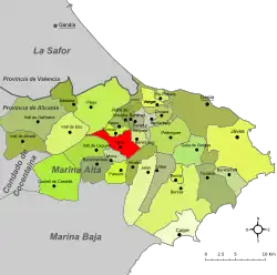 It is situated in the River Gerona valley[2] and is bordered by Pego to the north; Benidoleig and Ondara to the north-east; Xaló and Pedreguer to the east and Parcent and Alcalalí to the south.