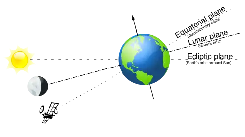 For geostationary spacecraft, thruster burns orthogonal to the orbital plane must be executed to compensate for the effect of the lunar/solar gravitation that perturbs the orbit pole with typically 0.85 degrees per year.[3] The delta-v needed to compensate for this perturbation keeping the inclination to the equatorial plane amounts to in the order 45 m/s per year. This part of the GEO station-keeping is called North-South control.[4]