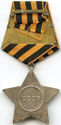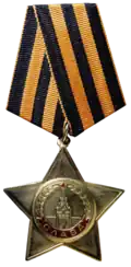 The Order of Glory (Russian: Орден Славы, romanized: Orden Slavy) was a military decoration of the Soviet Union established by Decree of the Presidium of the Supreme Soviet on November 8, 1943.[1] It was awarded to soldiers and non-commissioned officers of the Red Army as well as to aviation junior lieutenants, for bravery in the face of the enemy.