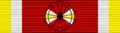 The ribbon of the Order is actually the colours of the flag of San Marino, used between 1465 and 1797.[29] The ribbon is made up of the three colours, with a larger field of burgundy in the center, edged with smaller bands of white and orange on both sides.