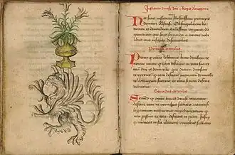 The device of the order was a chain bearing a jar of lilies, symbolizing the purity of the Virgin, which was already a common symbol of the Annunciation; an effigy of Virgin and Christ child; and a griffin, which should probably be read as symbol of war against the infidel. Members also wore a white stole.[3] The statutes of the order appear to have been given on the occasion of its founding. They survive in a manuscript in the Escorial and have been published as Reglas y Divisa de la Orden Militar de la Jarra.[1] Their explanation of the symbolism of the device is: