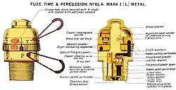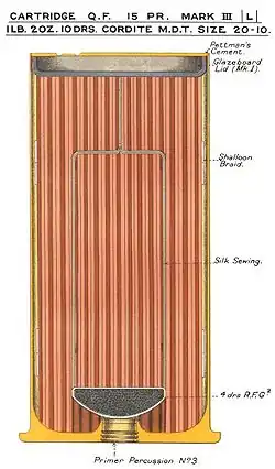54,000 complete rounds (i.e. shell, fuze, cartridge) of German design and manufacture were originally supplied with the guns.[8] These were replaced by British manufactures when used up. The following diagrams show British-made ammunition available in World War I.