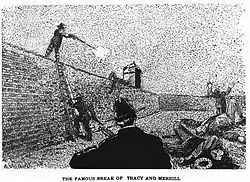 Escapes continued at the new facility, despite the wall and the Boot. The most famous of these occurred in 1902, when Harry Tracy and David Merrill killed three guards with a gun.[4] Details about this period can be read in Thirteen Years in Oregon State Penitentiary, a book written by Joseph "Bunko" Kelly. Kelly describes scenes of extreme brutality, particularly floggings, which he recounts happening to white people, black people, Native Americans, and a Chinese "half boy and half woman". He describes negligent doctors and a lack of mental health care, and complains that whiskey drinking affects the behavior of the guards. He also identifies a five-year period in which the warden stopped newspaper deliveries to prevent convicts from learning of pardons.[5] The prison announced in 1904 that it would end the use of flogging, and instead punish prisoners by spraying them with cold water from a garden hose.[6]