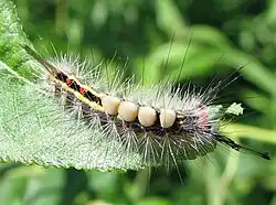The larvae are brightly colored, with tufts of hair-like setae. The head is bright red and the body has yellow or white stripes, with a black stripe along the middle of the back. Bright red defensive glands are seen on the hind end of the back. Four white toothbrush-like tufts stand out from the back, and a gray-brown hair pencil is at the hind end. The four white tufts on the larva's back may mimic the cocoons of parasitic wasps.[3] Touching the hairs sets off an allergic reaction in many humans.[2] Young larvae skeletonize the surface of the leaf, while older larvae eat everything except the larger veins.[4]: 72–73 They grow to about 35 mm long.