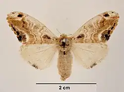 The wingspan is 21–29 mm for males and 30–42 mm for females of the first two generations.[2]
