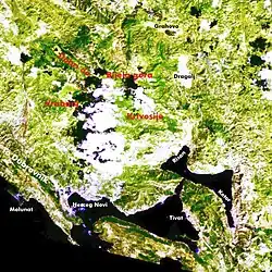 Orjen comprises transboundary area of about 400 km2 between Bosnia and Herzegovina and Montenegro, and runs for 25 km from region around Trebinje in Bosnia and Herzegovina in the north-west, to Bay of Kotor in Montenegro in the south-east. Mount Orjen is composed of four high karstic plateaux divided by ridges. Three near parallel ridges collide in Veliki kabao, Orjens' culmination point. The ridges are arranged by elevation with the highest to the north screening the Bijela gora plateaux from the Mediterranean coast. The separated plateaux are the Krivošije to the East, Bijela gora to the North, and Dobri do and Vrbanj to the West. Only few settlements are scattered in surrounding poljes. The poljes of Grahovo, Dragalj, Vrbanj, Krusevica and Grabalj are important for agricultural use and provide the only lines of communication in the karst. Migration circled around Mount Orjen as a major obstacle between the coastal, Herceg Novi and Risan and the interior towns of Grahovo, Trebinje and Nikšić.