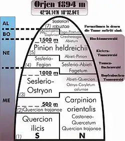 | 1,100- 1,450 | Oromediterranean NE= Nemoral (temperate zone) | Seslerio autumnalis–Fagetum (Horv.) Wrab. (Sesleria autumnalis, Fagus sylvatica), Pinion heldreichii (Pinus heldreichii), Oreoherzogio-Abietetum illyricae Fuk. (basic soil, Abies alba), Seslerio autumnalis–Abietetum illyriacae (Horv.) Fuk. |