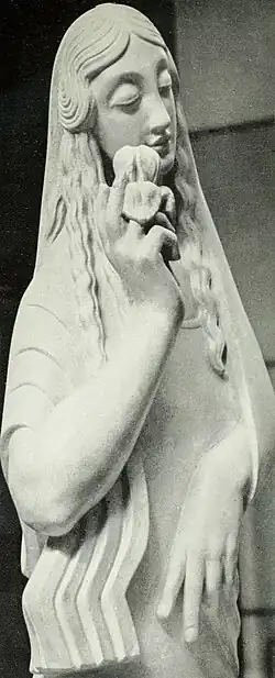 Dutton's architectural decoration continued in 1938 with his contribution of a symbolic bas-relief to the facade of Anzac House in Collins Street of a man holding high the Lamp of Honour while crushing the Serpent of Evil with his heel.[27] That year in Adelaide, he received the Melrose Prize for a portrait bust of writer Robert H. Croll and the Art Gallery of South Australia, belatedly strengthening its sculpture collection, was the first to acquire Dutton's work, purchasing his stone carving Jeune Fille[28][29] from the 1939 South Australian Society of Arts spring show through the Morgan Thomas Bequest Fund.[30][31]