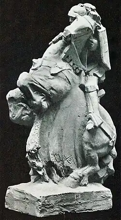In April 1933 the first group exhibition of sculpture to be held in Melbourne was organised by members Dutton, Bowles, Wallace Anderson, Ola Cohn, George Allen, and Charles Oliver.[22] Arthur Streeton enthusiastically welcomed the exhibition and expressed surprise that Australia, which had a clear atmosphere and a suitable climate to show sculpture to its best advantage, did not make more of it.[23] An illustration of Dutton's plaster maquette of St. George from the show was published in Art in Australia in December that year.[24] After joining the Victorian Artists Society, his Troubadour was exhibited at their galleries in East Melbourne in May 1935.[25]