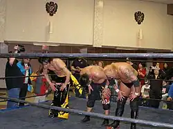 (Left to right) Kudo, Miyawaki and Yoshiaki Yago at Chikara King of Trios in February 2007