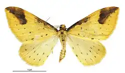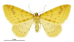 Male.— 30 mm. Forewings moderate, hindmargin hardly rounded; bright yellow; base of costa dark fuscous-purple; a curved row of three very small dark purple-fuscous spots about J, and another of four spots before middle, costal spots larger; a triangular purple blotch on costa before apex, reaching half across wing, anteriorly margined by a strongly sinuate bluish-black streak; a row of three dark purple-fuscous dots from apex of this to inner margin, and a subterminal row of six similar dots; cilia yellow. Hindwings moderate, hindmargin rounded; rather paler than forewings, with two curved posterior rows of cloudy purple-fuscous dots.[3]