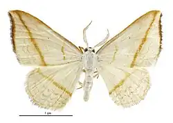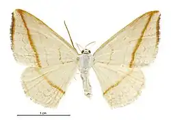 The expansion of the wings is 1+18 inches. The fore wings are rather broad with the apex very slightly projecting and the termen slightly bowed; cream-coloured with bright brown markings; there is a narrow line along the costa; a faint slightly curved line on the inner edge of the median band; a small blackish discal dot; a straight, oblique, very strongly marked line from near the apex to the dorsum at 34, and a very faint wavy subterminal line; a dark brown terminal line is situated below the apex, where the cilia are also dark brown. The hind wings are cream-coloured with a conspicuous brown line across the middle and very faint traces of one basal and two subterminal lines. Except as above indicated the cilia of all the wings are cream-coloured.[3]