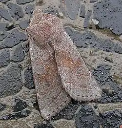 The wingspan is 34–40 mm. Forewing dull lilac grey speckled with darker: inner and outer lines purplish brown, the median area either filled with brown or with a broad brown median shade; submarginal line broadly pale with dark line before it, nearly straight; upper stigmata large, outlined with pale: hindwing dull brownish grey. Distinguished from O. incerta by the straighter costa and more produced apex of forewing. In this insect the continental forms are darker than those found in Britain, of which the commonest is ab. grisea Tutt with pale ochreous-grey ground with the pale edges of stigmata strongly marked and broad submarginal line; — brunnea Tutt has the whole wing brownish, but the edges of stigmata and the submarginal line still pale; — but in unicolor Tutt the whole wing is brown.[1]