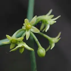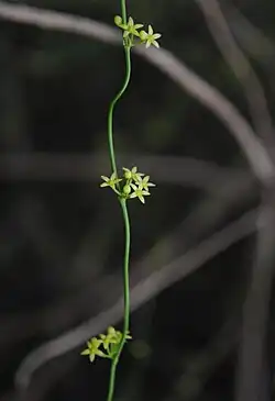 Orthosia scoparia, commonly known as the leafless swallow-wort, is a species of flowering plant in the genus Orthosia. It is an herbaceous vine with narrow opposite leaves. It is a host plant for the caterpillars of various butterfly species as well as Sephina gundlachii. It is in the Apocynaceae (Dogbane) family.[2] It grows in the Southeastern U.S. and Caribbean and is native in the Bahamas, Cuba, Dominican Republic, Florida, Georgia, Haiti, Jamaica, Mississippi, Puerto Rico and South Carolina.[3] A perennial it has yellowish / greenish white flowers. Caterpillars of the faithful beauty moth (Composia fidelissima) are thought to feed on it.[4]