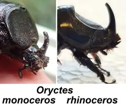 The size, life cycle, host plants and status as an agricultural pest of O. monoceros are similar to that of Oryctes rhinoceros in the Asia/Pacific region. Because of these similarities, the morphological differences between both species are of interest. In addition, there is a slight overlap in the distribution of both species, e.g. in Réunion.[10][11] In O. rhinoceros, the tip of the hind tibia has only two fixed spikes (subgenus Rykanes), while there are three in O. monoceros (subgenus Rykanoryctes). In addition, the horn of male O. monoceros is shorter than that of male O. rhinoceros and more curved to the rear.[5] However, in both species, there is also a large variation in the length of the horn.[12]