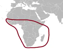 The type locality of Oryctes monoceros is Senegal, but this is the northern (and western) limit of its distribution range which extends in the South up to South Africa and includes most parts of sub-Saharan Africa.[1][5] It is especially common in tropical western Africa like the Ivory Coast, Ghana, Togo, Benin and Nigeria. In central and eastern Africa, the northern limits are the southern parts of Chad and Ethiopia. O. monoceros has been also frequently reported from the coastal areas of eastern Africa, like those of Kenya, Tanzania, Mozambique and South Africa. Further, it is found in Madagascar and eastern islands like the Seychelles and Réunion.[5][2][7] Ecological studies suggested that the highest environmental suitability for O. monoceros is found in the coastal areas of sub-Saharan Africa.[8]