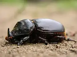 Oryctes monoceros, commonly known as African rhinoceros beetle, is a species of rhinoceros beetles from the subfamily Dynastinae (family: Scarabaeidae) which is common in sub-Saharan Africa.[2] Its distribution extends from Senegal and Chad in the North to South Africa in the South and includes the islands of Madagascar, Seychelles and Réunion in the East.[5] O. monoceros is similar in size (~ 4 cm long) and biology to O. rhinoceros found in tropical parts of Asia and the Pacific. Both species are serious pests of coconut and oil palms and attack these by boring into the crown of the palms and feeding on the young developing fronds.[6] Taxonomically, O. monoceros and O. rhinoceros belong to different subgenera of Oryctes, the main differences between both species are: Oryctes monoceros (subgenus Rykanoryctes) has 3 immovable spikes at the tip of the hindtibia and on average males have a shorter horn than O. rhinoceros which is more strongly curved backwards. Oryctes rhinoceros (subgenus Rykanes) has 2 immovable spikes at the tip of the hindtibia and on average males have a longer horn than in O. monoceros which is only slightly curved backwards.[5]