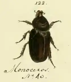 Oryctes monoceros was described by Olivier under the name Scarabaeus monoceros before the genus Oryctes was introduced. However, among his listing of 241 species of Scarabaeus, Olivier placed the species monoceros next to the species nasicornis, the type species of Oryctes, noted the similarity to Oryctes rhinoceros (Scarabaeus rhinoceros) and grouped it together with three other species now assigned to Oryctes, O. boas, O. augias and O. tarandus. Hermann Burmeister assigned Scarabaeus monoceros to the genus Oryctes and Sebö Endrödi established that the subsequently described species Oryctes insularis and Oryctes blucheaui are synonyms of Oryctes monoceros.[26][5]