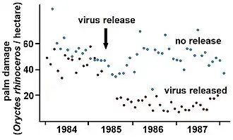 The palm damage depends on the density of palms, since the same number of O. rhinoceros adults per hectare will cause less damage in areas with a high palm density compared to areas with a low palm density. For accurate comparison of the effect of the virus on the O. rhinoceros population, it is therefore necessary to account for the density of the palms and convert the palm damage into an estimate of the number of feeding O. rhinoceros adults per hectare.[18][13] In the Maldives, such a conversion showed that the introduction of the virus often reduced the number of O. rhinoceros adults attacking coconut palms to less than one quarter of the level before the release.[18]