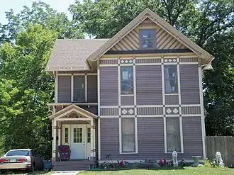 The Oscar Nichols House is a historic building located on the east side of Davenport, Iowa, United States. The house was built in 1884 by Oscar P. Nichols, who was a partner in the Davenport Nursery.[2] The house is an example of Stick-Eastlake style of architecture. It is a version of the Queen Anne style where the wooden strips were applied to the exterior of the structure in vertical, horizontal. and on the diagonal to give it a basket-like quality.[3] Other decorative elements applied to exterior of this house include the decoratively carved front porch that features an openwork tympanum at its gable end, the diagonal stickwork in the front gable end, a belt course of vertical strips between the first and second floor and molded vergeboards. It has been listed on the National Register of Historic Places since 1983.[1]