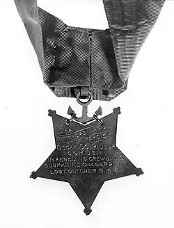 On October 9, 1918, while a crew member on USS Chestnut Hill (ID-2526), he assisted in the rescue of crewmen from the burning submarine chaser USS SC-219 following a gasoline explosion.[3] For this act, he was awarded the Medal of Honor.