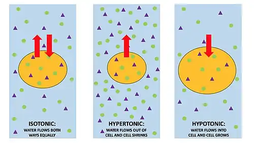 Osmotic shock or osmotic stress is physiologic dysfunction caused by a sudden change in the solute concentration around a cell, which causes a rapid change in the movement of water across its cell membrane. Under hypertonic conditions - conditions of high concentrations of either salts, substrates or any solute in the supernatant - water is drawn out of the cells through osmosis. This also inhibits the transport of substrates and cofactors into the cell thus “shocking” the cell. Alternatively, under hypotonic conditions - when concentrations of solutes are low - water enters the cell in large amounts, causing it to swell and either burst or undergo apoptosis.[1]