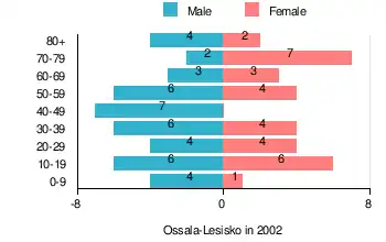 According to the 2002 Poland census, there were 73 people residing in Ossala-Lesisko village, of whom 57.5% were male and 42.5% were female. In the village, the population was spread out, with 21.9% under the age of 18, 31.5% from 18 to 44, 20.6% from 45 to 64, and 26% who were 65 years of age or older.[2]