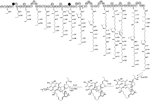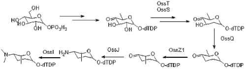 Polyketides members in this family have very similar skeleton which means they share a common pathway for their biosynthesis. However, ossamycin modular PKS is rare and unique since its programmed iteration is required to assemble its product considering that only 14 extension modules have to accomplish 15 cycles of polyketide chain extension in ossamycin. And cytochrome P450 enzymes are involved in post-PKS oxidation of the ossamycin macrocycle. Unusual 2,3,4,6-deoxyaminohexose sugar L-ossamine need to be attached to C-8 of the ossamycin macrocycle in tailoring stage.[7]