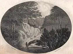 Garnett in 1800 visited the site. He describes the 'Hall of Mirrors' as having its sides and ceiling covered with mirrors, in which "the cascade is seen by reflection, sometimes running upwards, contrary to the direction of gravity, and sometimes in a horizontal stream over the head."[6]