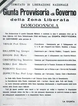 The Provisional Government Council took office on September 11, 1944[9] at the Civic Palace in the city of Domodossola, by order of Major Dionigi Superti, commander of the Val d'Ossola Division and representative of the other Patriot formations of the Ossola Valley.[10] It had jurisdiction over all the liberated territories of the Ossola and Cannobina Valleys with a catchment area of more than 80,000 inhabitants.[11] The boundaries of the Republic started from Lake Maggiore including, at its limits, Cannero, Oggebbio, Trarego, Ghiffa, Premeno, Aurano, Intragna, Caprezzo, Cambiasca, Miazzina, Cossogno, San Bernardino Verbano, Mergozzo and Ornavasso (Cannobio was excluded).[12]