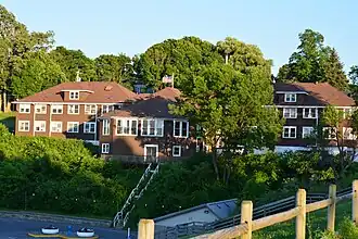 The first clubhouse was erected on the shores of Lake Ontario in 1883. Eventually more space was needed and OYC built a new clubhouse in 1919, the facility now known as the McCrobie Civic Center and for a time as the Naval Militia Building, a historic clubhouse building located at Oswego in Oswego County, New York. It was built in two phases; the center section was begun in 1914 and completed in 1919 as the yacht club. The east and west wings were added in 1949-50 by New York State when the building was occupied as the New York State Naval Militia Armory and U.S. Naval Reserve Training Center. The original section is a one-story Arts and Crafts style building with a walk out basement in the rear and Colonial Revival features. It was designed by noted Rochester architect Claude Fayette Bragdon (1866-1946). It is essentially a rectangular building with a hipped roof. It features a five sided room in the back with a five faceted hipped roof. The wings are two story structures measuring 70.4 feet by 40.4 feet. The city of Oswego acquired the building in 1978 for $50,000 and it is used as a municipal and recreation center.[2]