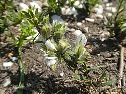 The flowers occur in small heads of 1 to 3 triplets in the axils of the upper few leaves on a stalk (or peduncle) of 2–3 mm (0.079–0.118 in) long. Each triplet is subtended by an oblong, softly hairy and glandular bract of 4 mm (0.16 in) long and 2 mm wide. The individual flower is 10 mm (0.39 in) long and sit on a flower stalk (or pedicel) of 2–3 mm (0.079–0.118 in) long, and is subtended by a densely hairy, narrow bract of 1 mm (0.039 in) long. The zygomorph calyx is 9 mm (0.35 in) long. The 5 sepals are merged at their base into a tube of about 2 mm (0.079 in) long, but form teeth towards the tip that are covered in small and large glands and are densely set with white hair on the outside. The upper four teeth are similar in shape and 5 mm (0.20 in) long and 2 mm (0.079 in) wide, the tooth adjoining the keel is 7 mm (0.28 in) long and 3 mm (0.12 in). As in most Faboideae, the corolla is zygomorph, forms a specialized structure and consists of 5 free white petals. The upper petal, called the banner or standard, measures about 10 mm (0.39 in) high and 6.0 mm (0.24 in) wide and consist of a claw of 0.5 mm (0.020 in) long at its base, and an elliptic blade. The blade is adorned by a purple area at the base of about 4 mm (0.16 in) high and 2 mm (0.079 in) wide, that functions as a nectar guide. On each side, an ear-shaped appendage reaches somewhat beyond the attachment to the claw, and the tip of the blade is pointy. The 2 lateral petals called wings are about 9 mm (0.35 in) long and 2.5–2.6 mm (0.098–0.102 in) wide, longer than the keel, each having a narrow claw at their base of 3 mm (0.12 in) long, and a wider blade with an ear-like extension blade, knife-like but with the tips bulging outwards and curving inwards. The blade is sculptured with 30–55 irregularly parallel lamellae. The 2 lower petals, jointly called the keel, consists of 3 mm (0.12 in) long claws at base and blades of 7 mm (0.28 in) long and 4 mm (0.16 in) wide. The keel envelops a tube of the 10 filaments, the 9 which are merged over almost the entire length are 7 mm (0.28 in) long and 1 that is attached at its base only is 6.0–6.5 mm (0.24–0.26 in) long. The tube formed by the filaments in turn encloses the 7 mm (0.28 in) long pistil. Its base is a so-called gynophore of 0.5 mm (0.020 in) long, followed by an ovary of 2.5 mm (0.098 in) with a papillose surface, next a glabrous style of 0.5 mm (0.020 in) thick at the point where it curves upwards for about 1.5 mm (0.059 in) and somewhat backwards. The ovary develops into a 1-seeded, hairless, papery thin fruit of 4 mm (0.16 in) long and 2 mm (0.079 in) with many glands.[1]
