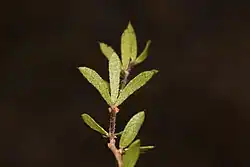 Otholobium curtisiae is a domed to spreading shrub of about 10 cm (3.9 in) high with several 5–10 mm (0.20–0.39 in) thick, curving stems that emerge vertically from the underground rhizome and which produce side shoots near their base. These stems are covered in brown bark that splits vertically and is covered with thickened, persistent scars of discarded stipules and old urn-shaped pustules. The young shoots are purplish green in colour and covered in both short and long, stiff hairs. Flowering shoots are clustered in the upper two axils of the new season's growth, set with dense white stiff hairs, and large urn-shaped pustules concentrated below the leaves. It has alternately set leaves, that each are accompanied at the base of the petiole by 2 awl-shaped, hairless stipules of 1.5–1.7 mm (0.059–0.067 in) long and about 1.0 mm (0.039 in) wide at their base, with a fringe of hairs along the edges and many orange coloured glands, particularly at their base. These stipules are fused only at their very base with the 0.5–1.0 mm (0.020–0.039 in) long petiole. The stipules become smaller further up the shoot. At the top of the petiole are 3 flat, inverted lance-shaped to elongated and roughly rectangular, dark green leaflets of about 7–12 mm (0.28–0.47 in) long and 2.5–3.0 mm (0.098–0.118 in) wide, with one clearly visible vein along the length and dome-shaped glands on the surface. The density of the glands is higher on the underside of the leaflets. The leaflets have a wedge-shaped base, an entire margin and a pointed tip as an extension of the midvein (or mucro) that is straight in adult leaves except for the first leaves of the season that have recurved mucros. Both leaflets on the side are somewhat sickle-shaped, longer than the one in the middle, and have a hairless surface except for few stiff hairs pressed against the surface along the margins.[1]