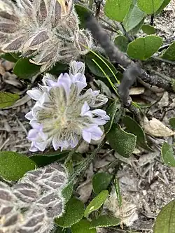 The oblong inflorescences emerge individually or in pairs in the axils of the youngest leaves of short, young shoots on 25–35 mm (0.98–1.38 in) long peduncles (about double the length of the subtending leaf) that are densely set with warts of about 0.2 mm (0.0079 in) high. The inflorescences themselves are 35–55 mm (1.4–2.2 in) long, and carry between 5 and 9 clusters of three flowers each that are borne on 2–4 mm (0.079–0.157 in) long pedicels. Each flower cluster is subtended by a fan-shaped to broadly oval-oblong, hairy bract, that carries glands and is eventually shed. The flowers are 8–10 mm (0.31–0.39 in) long, and initially are each subtended by a narrowly lance- to line-shaped bract of about 3 mm (0.12 in) long that is eventually shed. The calyx is merged in a bell-shaped tube of 2–3 mm (0.079–0.118 in) long but ends in five teeth. Its outer surface is covered in spreading, white 1.5–2 mm (0.059–0.079 in) long hairs and many small glands, but hairless on the inside. All teeth have a pointy tip. The tooth at the bottom of the flower is dark green, much longer (10–11 mm (0.39–0.43 in)) and wider (2–2.5 mm (0.079–0.098 in)) than the other four. These other teeth are pale yellowish green in colour. The two teeth adjoining the standard are sickle-shaped and fused together for about a third of their length, and about as long as the teeth to the sides of the flower. As in most Faboideae, the corolla is zygomorph, forms a specialized structure and consists of five free, white petals. The upper petal, called the banner or standard, is white to pale blue, about 13 mm (0.51 in) long and 8–9 mm (0.31–0.35 in), inverted egg-shaped, but oblong when the blade is curved backwards. The blade of the standard is extending down into a narrowed part called claw of about 2 mm (0.079 in) long. The two side petals called wings are shaped like a pruning knife, curving up relative to the keel, 10–12 mm (0.39–0.47 in) long and 3–4 mm (0.12–0.16 in) wide. The blade of the wing is adorned with an area of ridges and has one lobe or auricle facing the base. The claw of the wing is about 3 mm (0.12 in) long. The wing petals envelop and are very lightly attached to the keel. The two keel petals are fused at the bottom and form a boot-like structure. The keel petals are white with a purple blotch at the tip, about 9 mm (0.35 in) long and 2.5–3 mm (0.098–0.118 in) and extend towards the base in a narrowed claw of about 4 mm (0.16 in) long. The keel envelops a hollow, open tube of about 8 mm (0.31 in) long, made up of nine merged filaments and one free stamen. The anthers are all equal and approximately 0.3 mm (0.012 in) long. Largely hidden in this androecium is an approximately 8 mm (0.31 in) long pistil, including at its base a gynophore of about 1 mm (0.039 in) long that carries the softly hairy ovary of 1.8–2 mm (0.071–0.079 in) long. At the tip, the ovary extends into a sparsely hairy, forward sloping style that strongly widens at the place where it curves upwards 2.5–2.8 mm (0.098–0.110 in) from its end. The style is topped by a stigma with few brushlike hairs. Fruits and seeds were unknown at the time of the description of this species.[2]