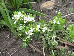 Otholobium saxosum is a small shrublet of up to 20 cm (7.9 in) high that has been assigned to the Pea family, with branches upright or horizontal at the base with rising tips. It has sessile, clover-like leaves and white, pea-like flowers that grow in triplets in the axils of the upper leaves of new, short side shoots. The species is only known from Garcia's Pass in Western Cape province of South Africa. Flowering occurs in October and November.[1]