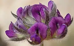 The flowers grow in roundish heads of 6-15 together on peduncles of 5–20 cm (2.0–7.9 in) long that emerge from the axils of the leaves. Each head consist of 2-5 triplets of flowers, the lowest of which is subtended by a semi-circular, hairy bract that divides in 2 or 3 teeth. These bracts gradually get narrower for triplets implanted further to the tip of the petiole. Each individual flower sits on a pedicel of 1.5–2.0 mm (0.059–0.079 in) long and is subtended by a very narrow bract. The flowers are each 8–11 mm (0.31–0.43 in) long. The five hairy 11–13 mm (0.43–0.51 in) long sepals are merged into a calyx tube at the base of 2.5–3.0 mm (0.098–0.118 in) long, end in separate teeth, and enclose the petals in the bud. The lower tooth, subtending the keel, is 9–10 mm (0.35–0.39 in) long and 3.0–3.5 mm (0.12–0.14 in) wide and has prominent netted veins. The remaining four teeth are all curved, narrowly triangular in shape, 5.5–6.0 mm (0.22–0.24 in) long and 1.5–2.0 mm (0.059–0.079 in) wide. As in all Faboideae, the corolla is zygomorphic, forms a specialized structure and consists of 5 free petals. The corollas are initially mauve in colour but become purple with age. The upper petal, called the banner or standard, is large and envelops the other petals in the bud. It is slightly netted, teardrop-shaped, 8–10 mm (0.31–0.39 in) long and 5.0–6.5 mm (0.20–0.26 in) wide and narrows into a 3 mm (0.12 in) long claw at its base. The standard gradually curves back along its length. The two adjacent lateral petals that are called wings are 9.5–10.0 mm (0.37–0.39 in) long, with a blade of 6–7 mm (0.24–0.28 in) long and 2.2–2.5 mm (0.087–0.098 in) wide and have a sculpturing of 15-18 irregularly parallel ridges and an ear-shaped appendage reaching beyond the attachment to the claw. The wings are longer than and enclose the 2 bottom petals, which together are called the keel. The two keel petals have long claws and form a boat-like structure. The keel petals are also divided into a claw and a blade section, and the latter is 8 mm (0.31 in) long and 2 mm (0.079 in) wide, and has a rounded tip. The keel contains 10 filaments. The 9 filaments that are fused are 8 mm (0.31 in) long, while the one that is loosely attached for half of its length is 7.5 mm (0.30 in) long. The anthers are alternately fixed to their filament at the base and at midlength. The filaments envelop a swollen style of 8 mm (0.31 in) long, which contains at its base an ovary of 1.5 mm (0.059 in) long with some glands and curves about 2 mm (0.079 in) upwards before becoming the pin-shaped, papillose stigma.[1]