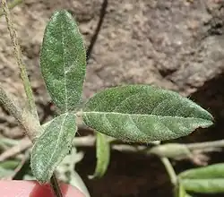 Otholobium swartbergense is a small spreading shrublet, with numerous slender stems that are covered in short hairs pointing toward the growing point and - particularly on the ribs - interspersed with longer, patent hairs. Its leaves are accompanied at their base by a pair of pointy, oval or shortly oblong, 5–7 mm (0.20–0.28 in) long and 18–30 mm (0.71–1.18 in) wide stipules, which are hairless on the inside and silky hairy on the outside. These stipules are partly merged with the base of the hairy petiole, which is about 5–7 mm (0.20–0.28 in) long. At its tip it carries three, flat, elliptical leaflets of 15–22 mm (0.59–0.87 in) long and about 6–8 mm (0.24–0.31 in) wide, with a blunt base, an entire margin and a tip that ends abruptly in a small, sharp, recurved point as a continuation of the midrib. The surface of the leaflets is silky hairy, more so on the lower surface and in particular along the veins. Leaflets become larger in leaves that are produced later in the growth season. The two leaflets to the sides are smaller than the one in the middle.[1]