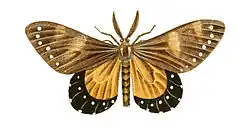 Upperside. Antennae strongly pectinated and brown. Head brown, the front being white. Thorax brown, with two white streaks along it. Abdomen brown. Wings black, streaked with light brown from the shoulders along the tendons, and two light yellowish patches, almost crossing the wings from the anterior edges, with a row of white spots placed along the external edges. Posterior wings dark yellow, with a deep black border running along the external edges from the upper to the abdominal corners.