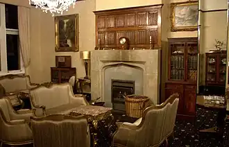The present building was constructed in 1870 for Lord James Douglas on land gifted as recompense for the death of his ancestor, Lord Douglas, who fought at the Battle of Otterburn.[6] Stables, lodges, and a farm were part of the 19th century complex.[8] By 1907, Sir Charles Morrison-Bell, 1st Bart., was the owner of Otterburn Hall.[9] During World War II, from 1940 to 1944, the hotel was used as a military hospital. The Otterburn Training Area, established in 1911 and owned by the Ministry of Defence, is nearby and is the second-largest live firing range in the country.[10] In 1948, the Hall was acquired by a group of Christian businessmen who wanted to start a new venture in Christian education.[11] By 1980, the building was converted into a hotel.[8]