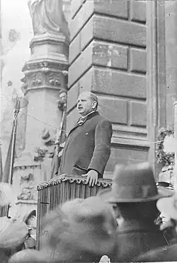 At the SDAP party congress on 31 October and 1 November 1918, Bauer stated that from the national standpoint as (cultural) Germans and from the international standpoint as Social Democrats, they must demand union with Germany.[12] In Parliament he said that opponents of Austrian unification with Germany were high traitors to the nation.[13] The Provisional National Assembly voted in favor of the union on 12 November 1918, and on 25 December Bauer addressed a note verbale to the victorious powers saying that union with Germany was the only and correct way forward.[14]
